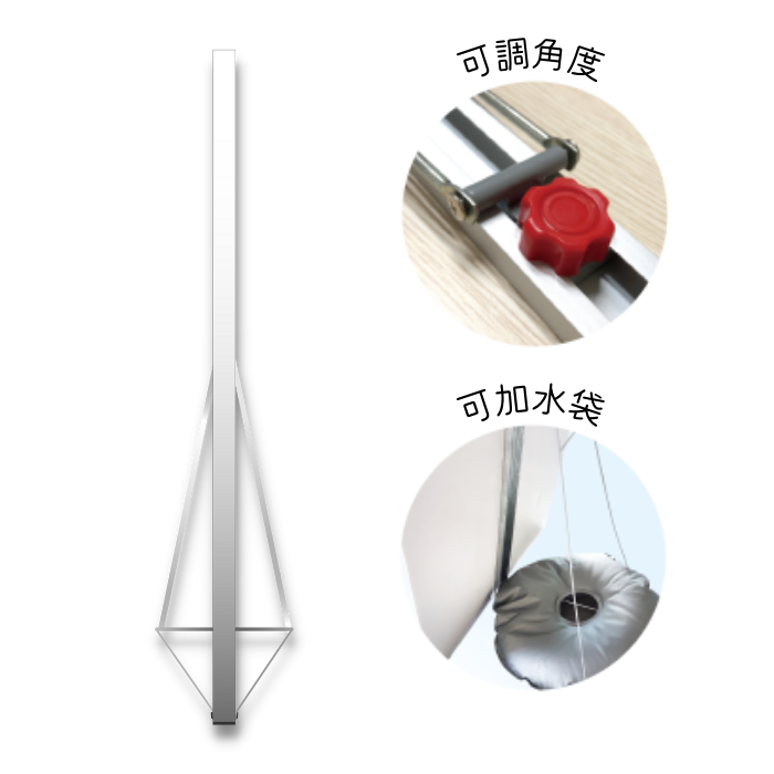 The frame is adjustable and a water-filled weight can be attached for support.